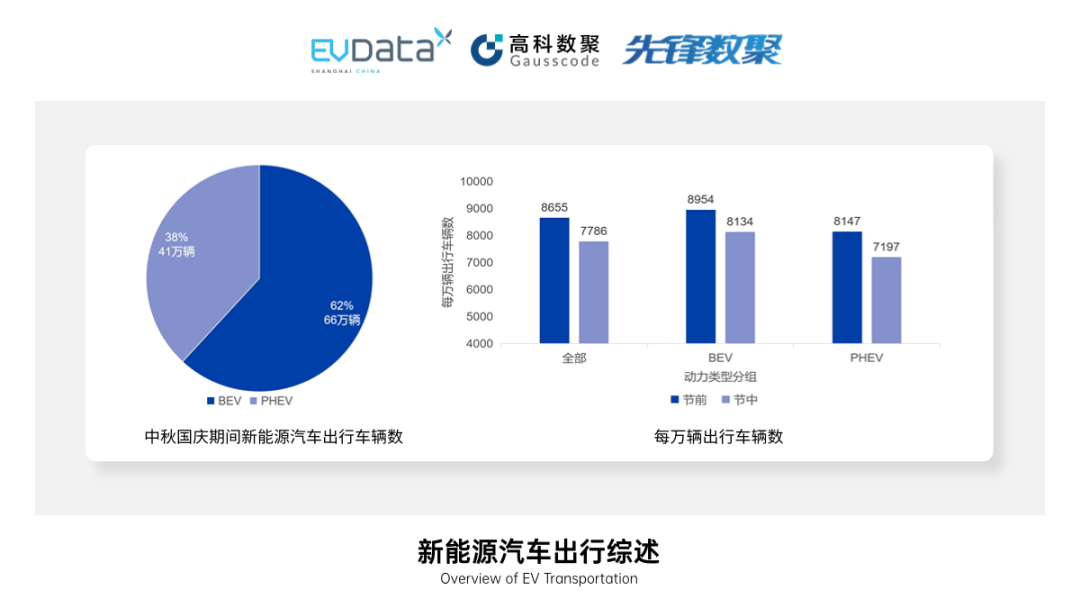 [1] 本文随机选取部分样本经过数据清洗后进行分析。并从时间上将观测期分为节前(9月22日-9月28日)和节中(9月29日-10月6日),从场景上分为市区出行和跨市出行,并采用每万辆出行车辆数对出行强度进行刻画。每万辆出行车辆数以观测期内总出行车辆数为基数计算,其中BEV和PHEV的出行强度则分别以观测期内BEV和PHEV的总出行车辆数为基数计算。
